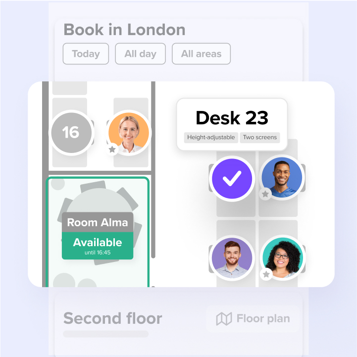 👉 Discover how your team can easily find their colleagues and book a desk in their favorite office area, thanks to our interactive floor plan feature.