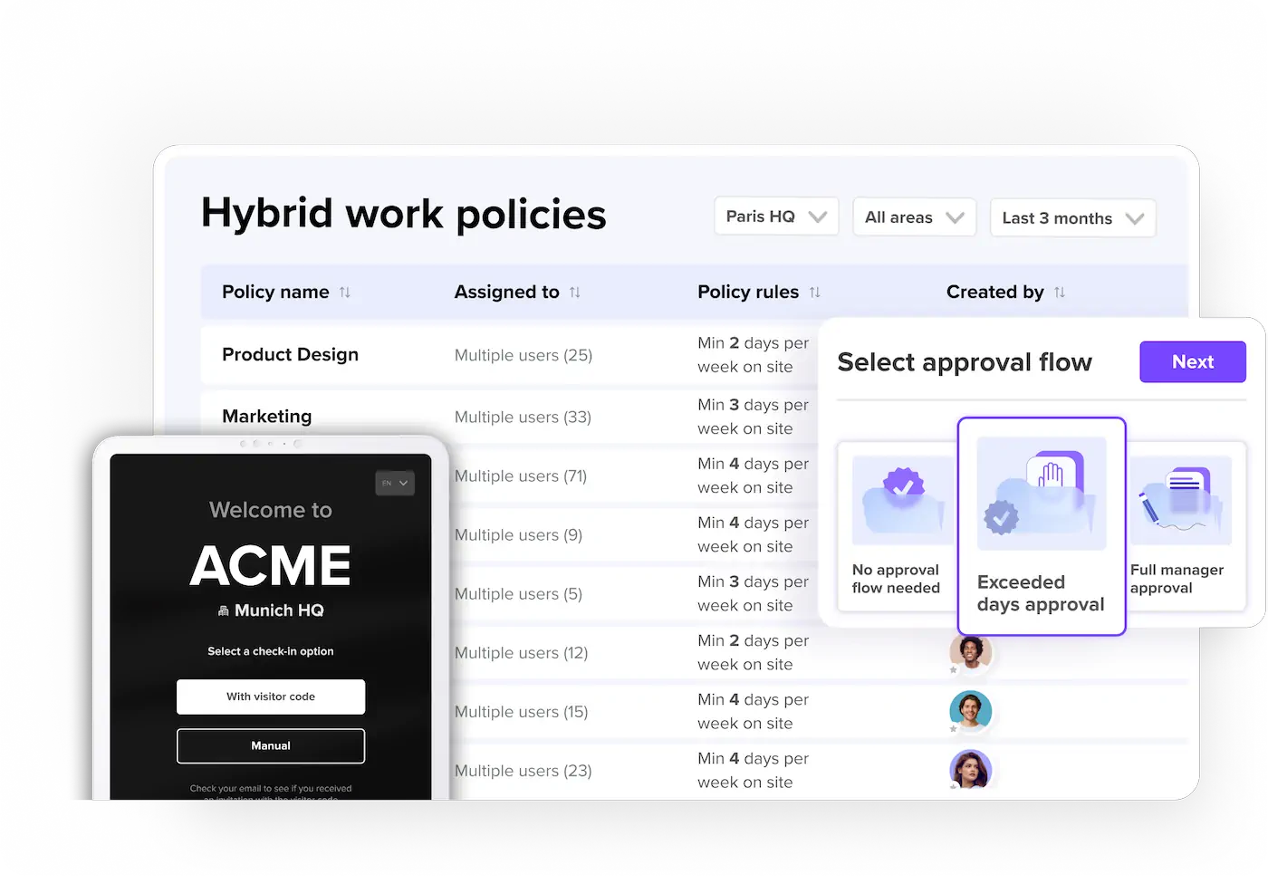 - People & presence: Track attendance patterns by office, department, or even individual users. Monitor policy adherence, spot quiet days, and ensure teams are balanced.
