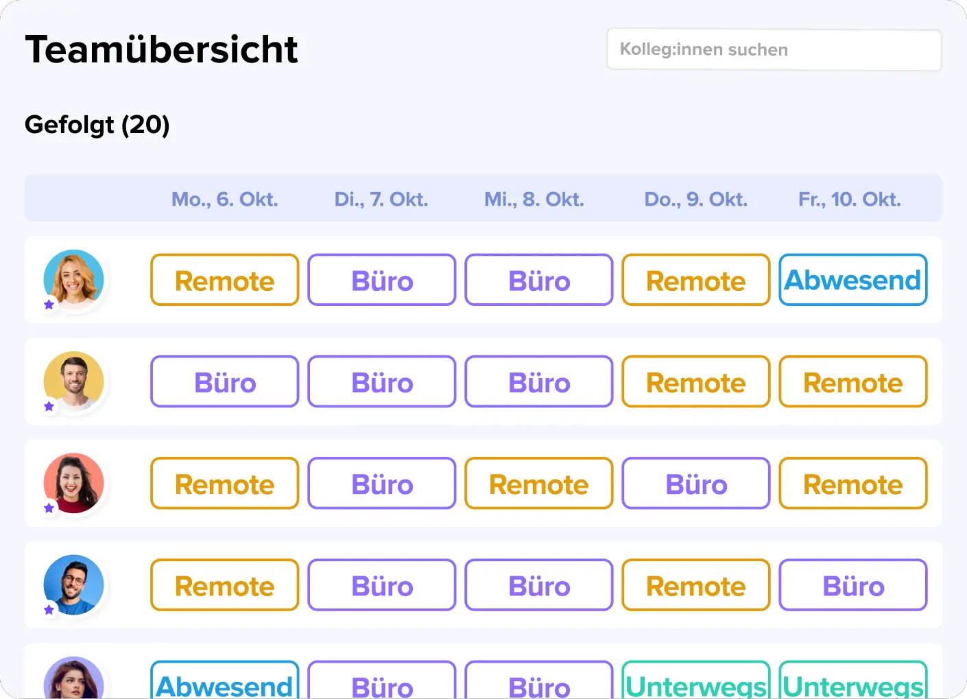 - Bürotage koordinieren: Stimmt eure Wochenplanung im Team so ab, dass sich Teammitglieder persönlich treffen können, um spontan zusammenzuarbeiten und den Teamzusammenhalt zu stärken.