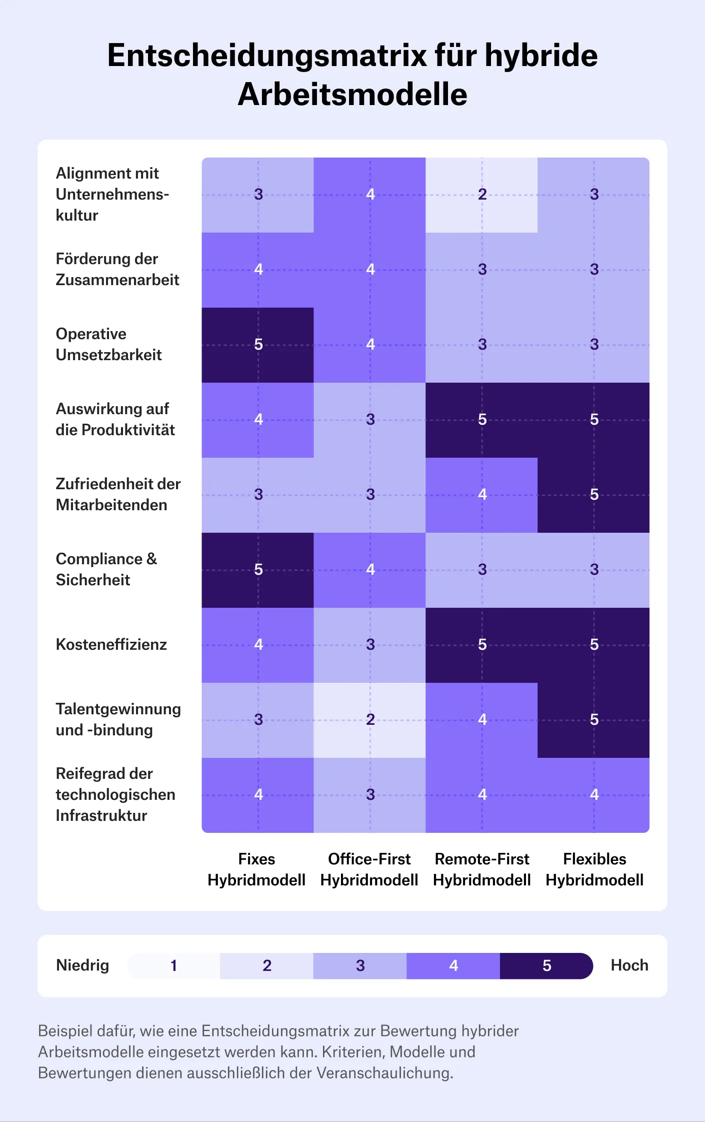 - Unternehmensziele: Legt fest, welche Ziele am wichtigsten sind (z. B. Produktivität, Innovation, Kosteneffizienz) und von dem gewählten Modell unterstützt werden sollen.