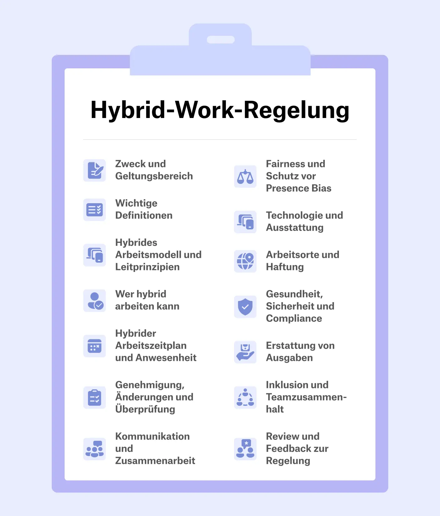 Bei der Gestaltung einer Hybrid-Work-Regelung geht es darum, einen klaren, fairen und anpassungsfähigen Rahmen zu schaffen, der sowohl für euer Unternehmen als auch für eure Mitarbeitenden funktioniert. Wirksame Richtlinien decken das Wesentliche ab (Zweck, Geltungsbereich, Anspruchsberechtigung, Arbeitszeitplan usw.) und lassen gleichzeitig Raum für regelmäßige Überprüfungen und Verbesserungen.