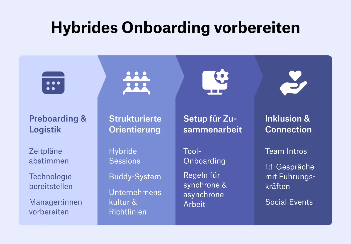 Onboarding in einer hybriden Umgebung bedeutet, eine integrative Erfahrung zu schaffen, die für Mitarbeitende, die remote, im Büro oder hybrid arbeiten, gleichermaßen gut funktioniert. Ein durchdachter, gut strukturierter hybrider Onboarding-Prozess hilft neuen Mitarbeitenden, sich vom ersten Tag an verbunden, unterstützt und produktiv zu fühlen. Ein Onboarding-Plan für hybrides Arbeiten kann die folgenden Schritte beinhalten.