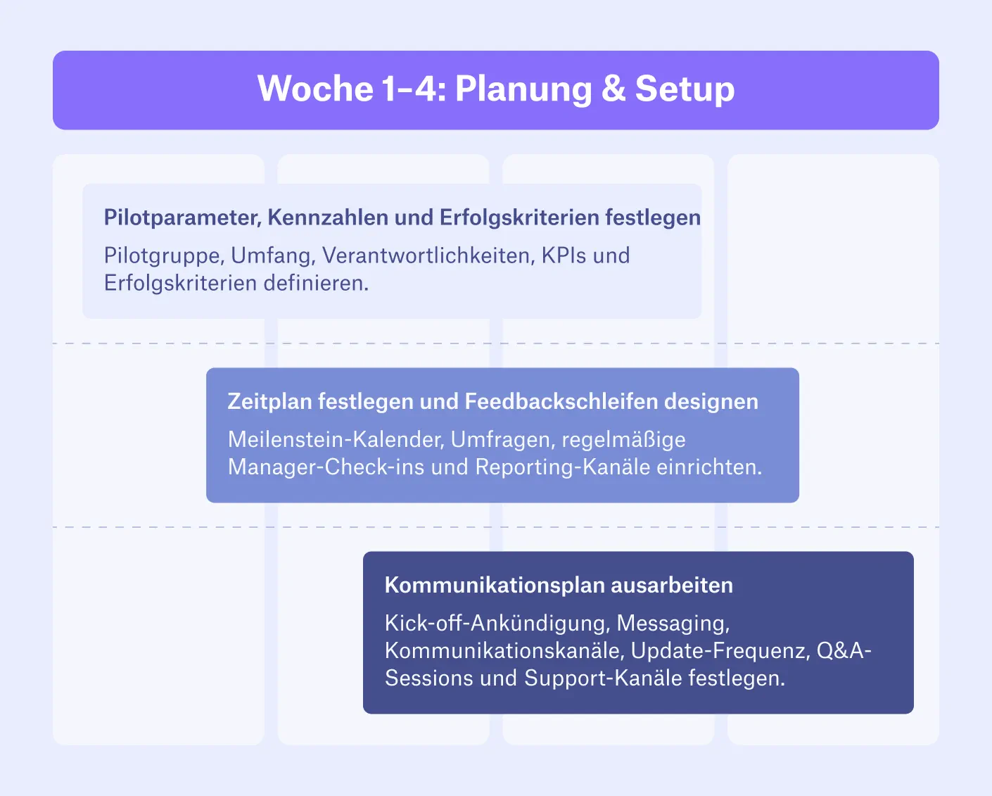 - Umfang des Pilotprojekts: Legt fest, wie lange ihr das Pilotprojekt laufen lassen wollt (z.B. 4-6 Wochen) und welche Arbeitsorte, Abläufe und Arbeitsmodelle ihr testen wollt.