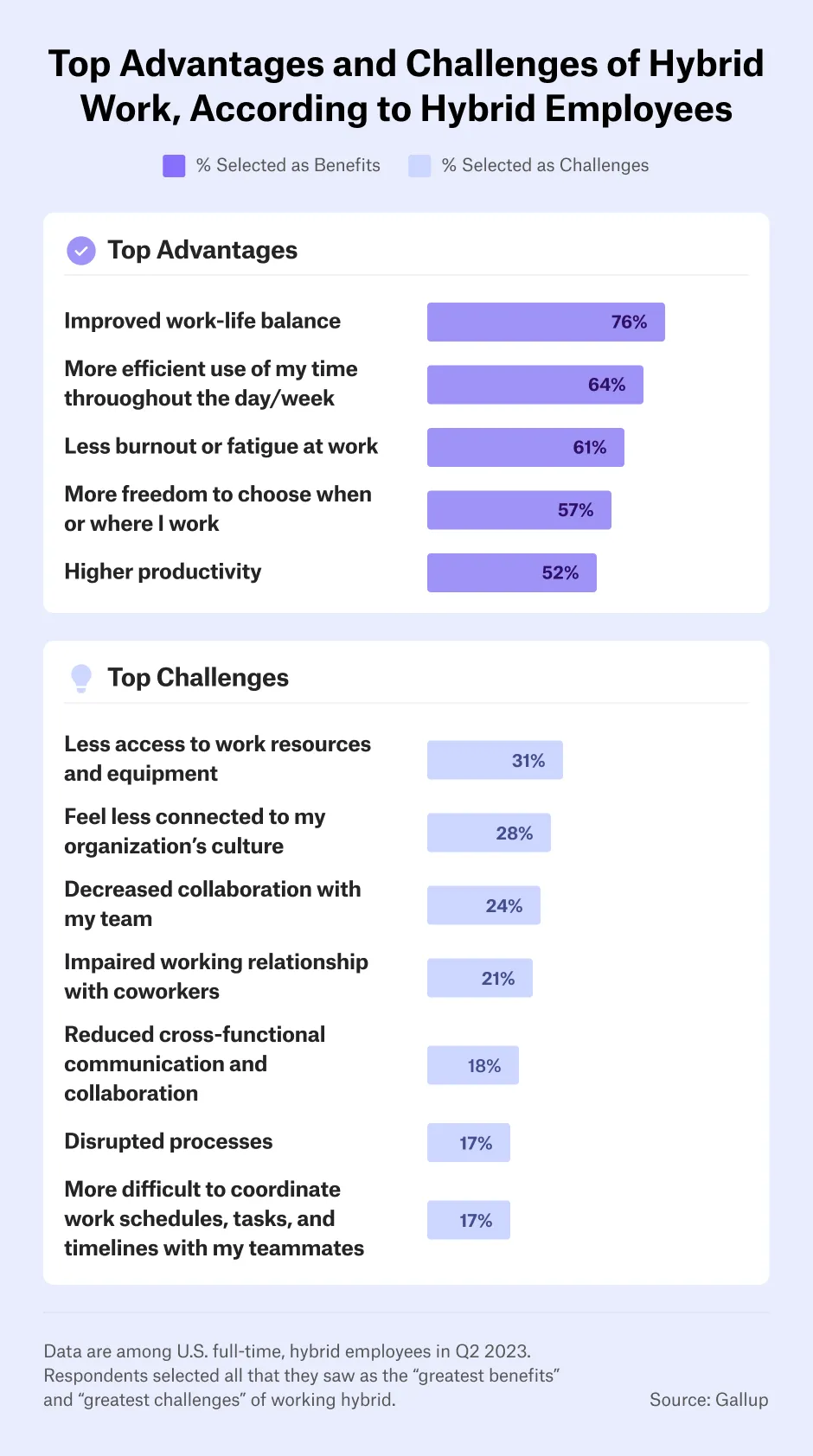 Hybrides Arbeiten schafft Flexibilität und Freiheit, bringt aber auch neue Hindernisse und Herausforderungen mit sich. Laut Gallup sind die drei größten Herausforderungen bei Hybrid Work der eingeschränkte Zugang zu den notwendigen Tools und Ressourcen (31 %), ein geschwächtes Gefühl der Verbundenheit mit der Unternehmenskultur (28 %) und eine reduzierte Teamarbeit (24 %).