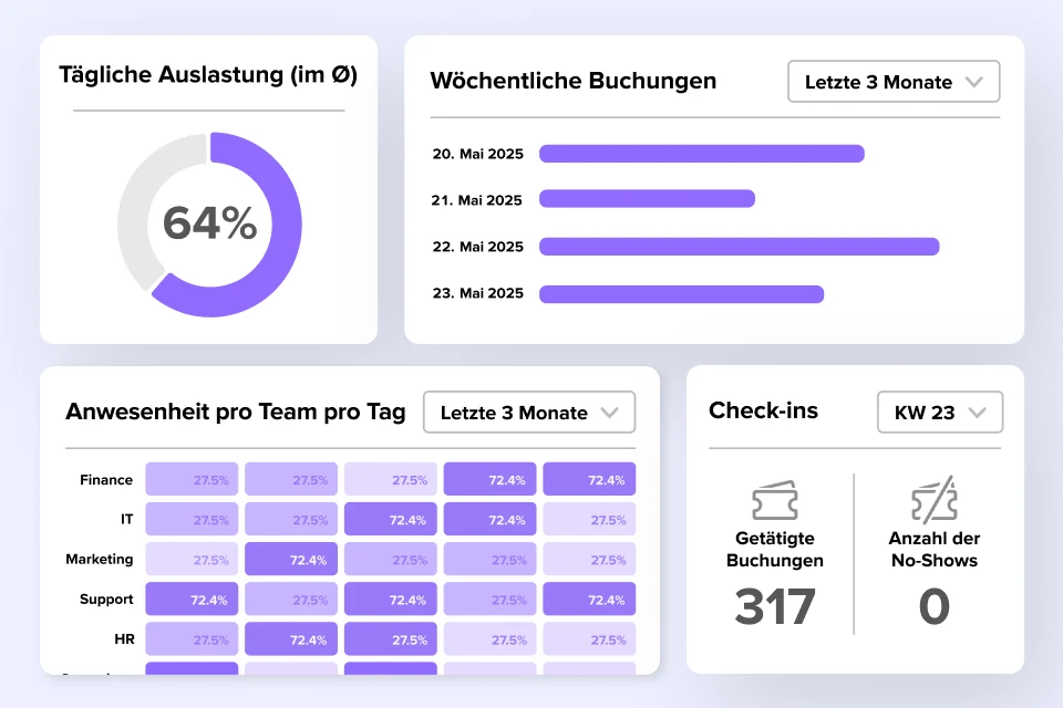 Die Analytics in deskbird verfolgen die Auslastung von Meetingräumen, die Buchungshäufigkeit, No-Shows und die Ressourcenauslastung. Diese Erkenntnisse helfen Facility-Teams, ungenutzte Räume zu identifizieren, die Raumgröße anzupassen und die Effizienz der Zusammenarbeit zu verbessern. Die Daten können auch aufzeigen, wann die Auslastung am höchsten ist, und zukünftige Entscheidungen zur Bürogestaltung unterstützen.