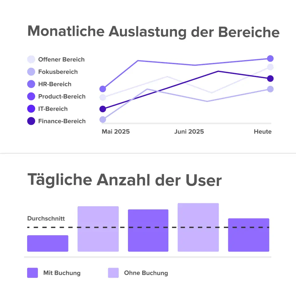 - Verbessere deine Planung und Budgetierung mit klaren, genauen Nutzungsberichten - gefiltert nach Team, Stockwerk oder Zeitraum