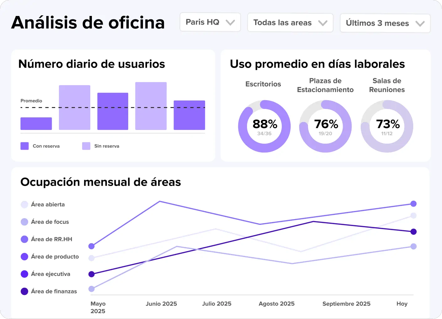 - Equilibra los negocios y las personas: realiza un seguimiento tanto de las métricas organizativas (costo, ROI, uso del espacio) como de las métricas humanas (compromiso, bienestar, intención de permanencia).