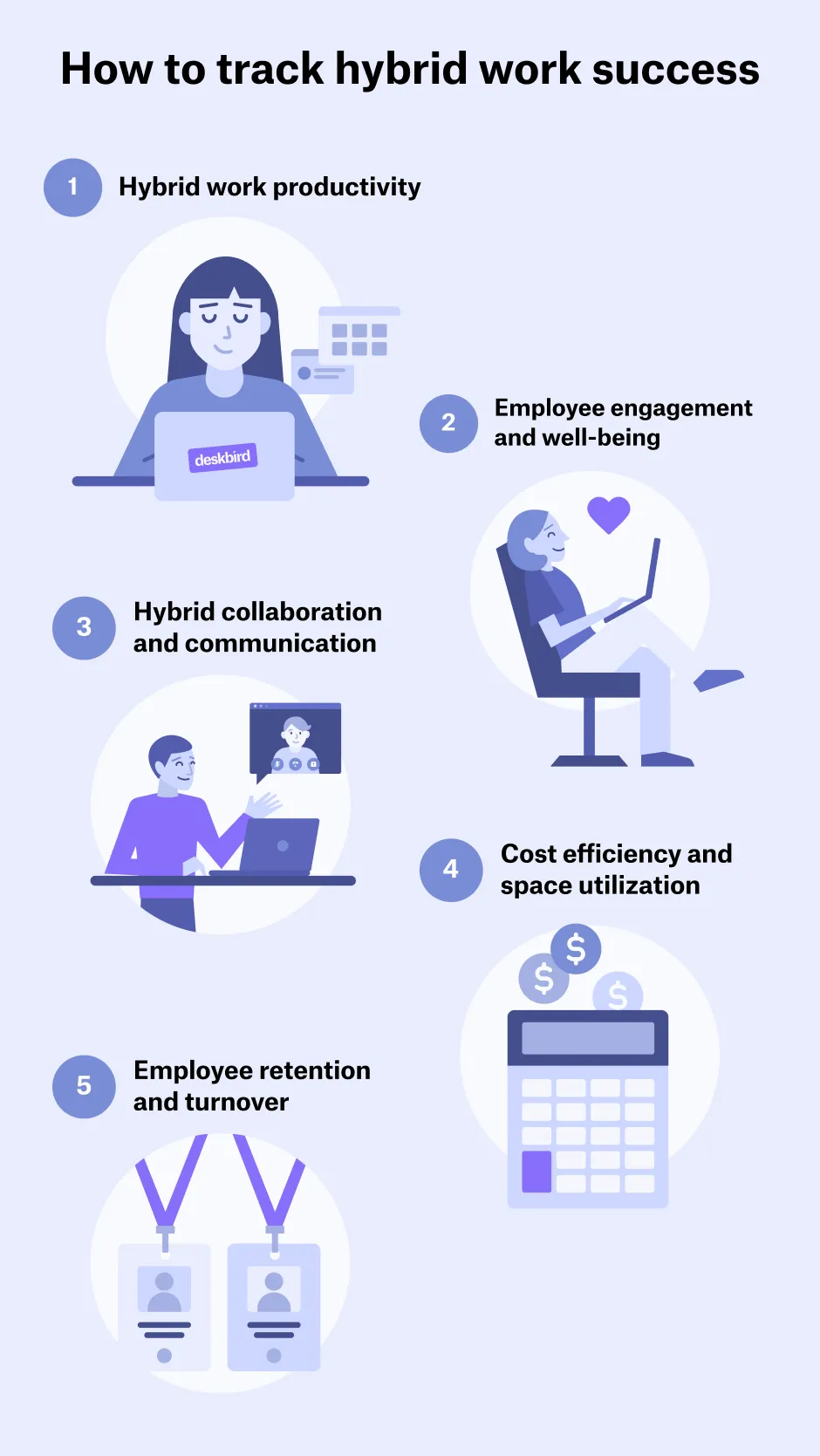 Las métricas del trabajo híbrido deben combinar indicadores tanto organizacionales como relacionados con los empleados. Los cinco aspectos esenciales son la productividad, el engagement, la colaboración, la eficiencia de costo y la retención. En conjunto, estas métricas te ofrecen una visión global de si tus políticas de trabajo híbrido están impulsando el rendimiento, apoyando a los empleados y aportando un valor real a tu negocio.