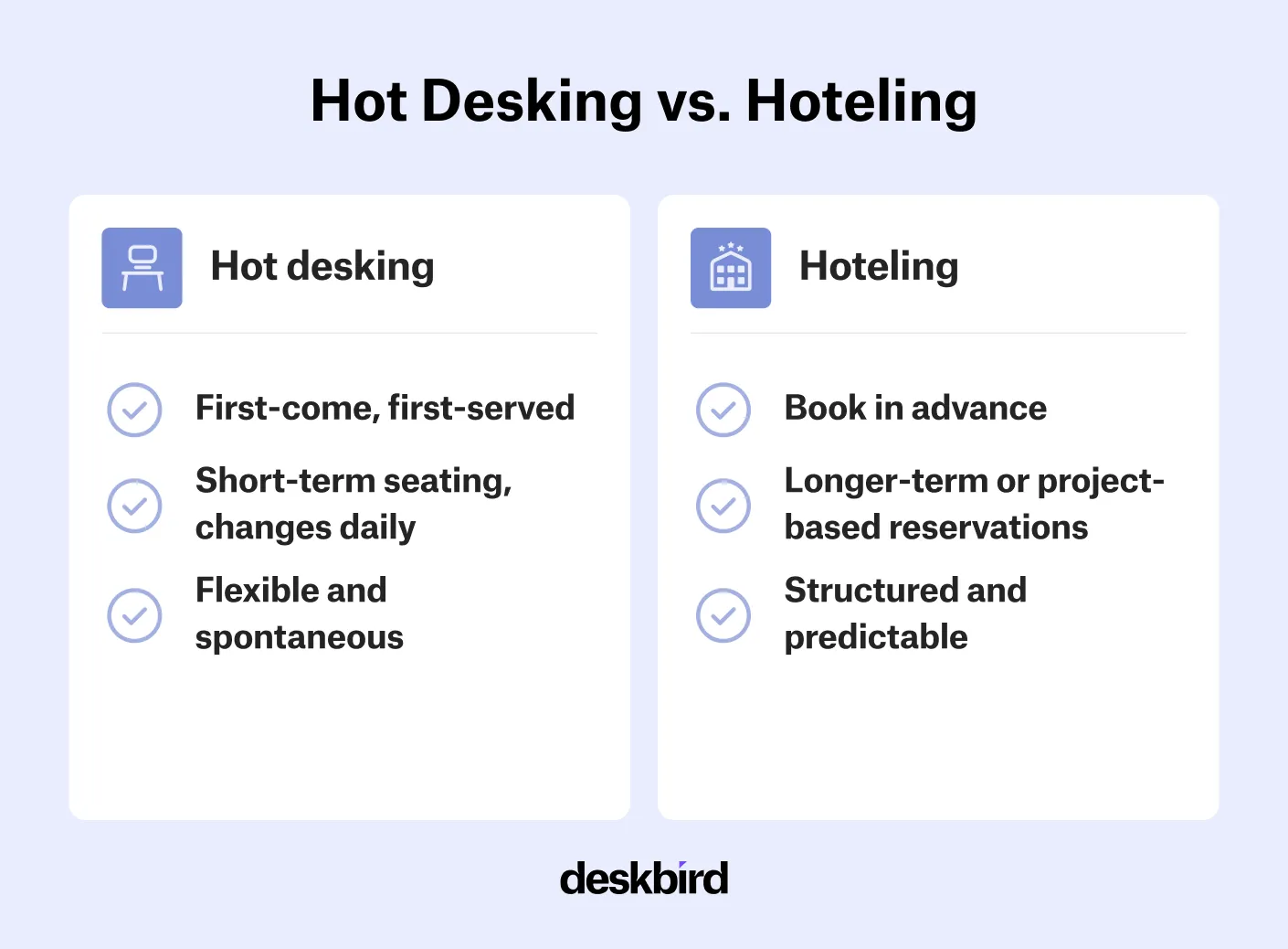 - Hôtellerie : les bureaux sont réservés à l'avance via un système de réservation et sont conservés pendant une période plus longue, souvent en fonction d'un projet.
