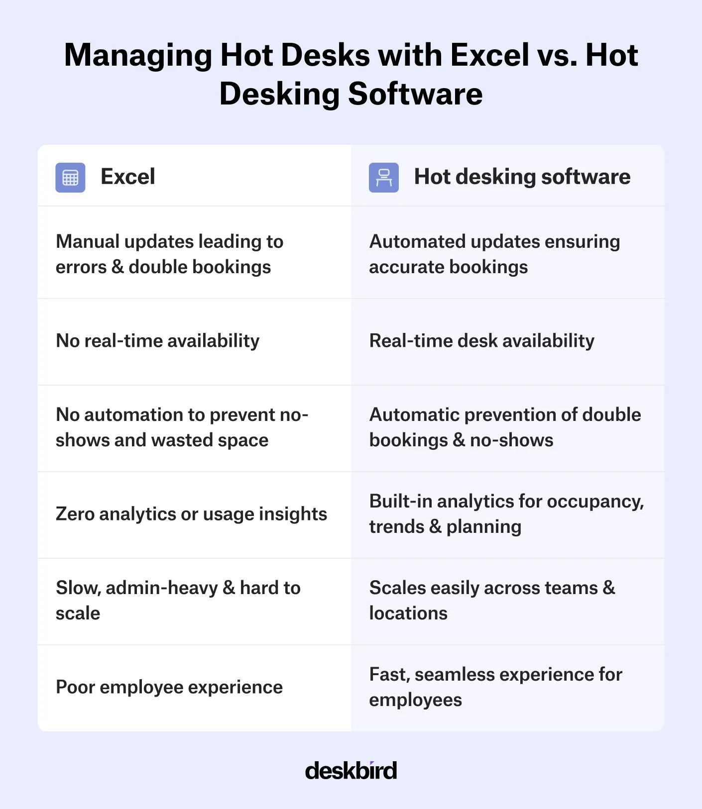 - Évitez les solutions de feuilles de calcul faites maison pour gérer les bureaux partagés dans votre organisation, car elles ne permettent pas d'automatiser les réservations, d'éviter les erreurs ou de fournir des informations réelles sur le lieu de travail.