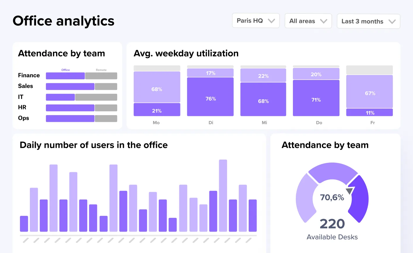 - Analyses : des analyses approfondies du lieu de travail qui mettent en évidence les tendances, les jours de pointe et les zones sous-utilisées vous aident à optimiser votre espace de bureau et à éviter des coûts immobiliers inutiles.