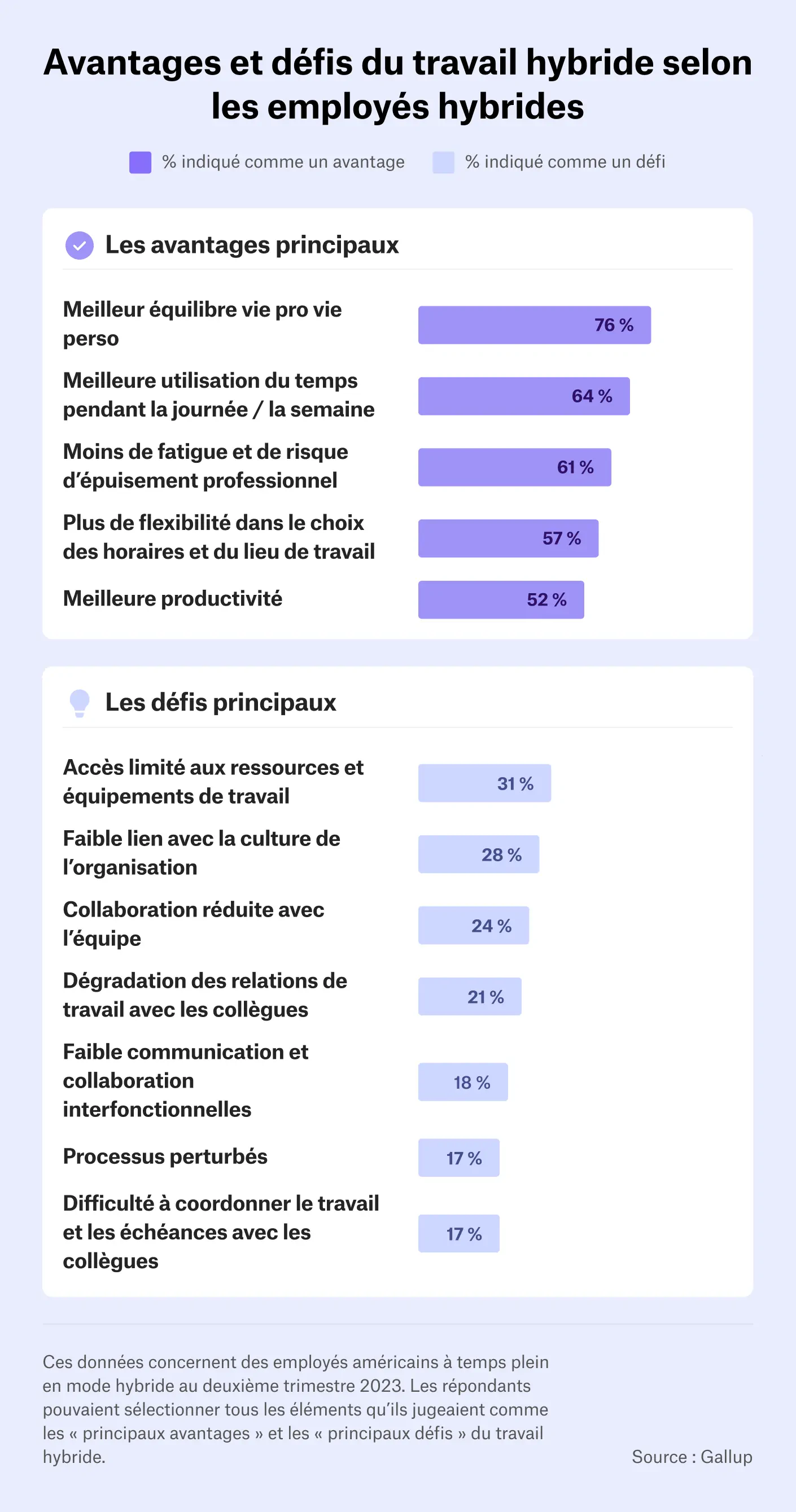 Le travail hybride est une solution flexible, certes, mais il présente également quelques obstacle et défi. Selon Gallup, les trois principaux défis du travail hybride sont l'accès limité aux outils et ressources nécessaires (31 %), un affaiblissement du sentiment d'appartenance à la culture d'entreprise (28 %) et une réduction du travail d'équipe (24 %).