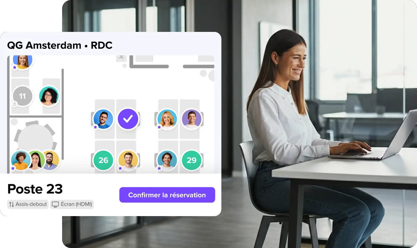 - Des systèmes de réservation de poste pour que les employés réservent des postes à l'avance et sachent où sont assis leurs collègues, tout en évitant les doubles réservations.