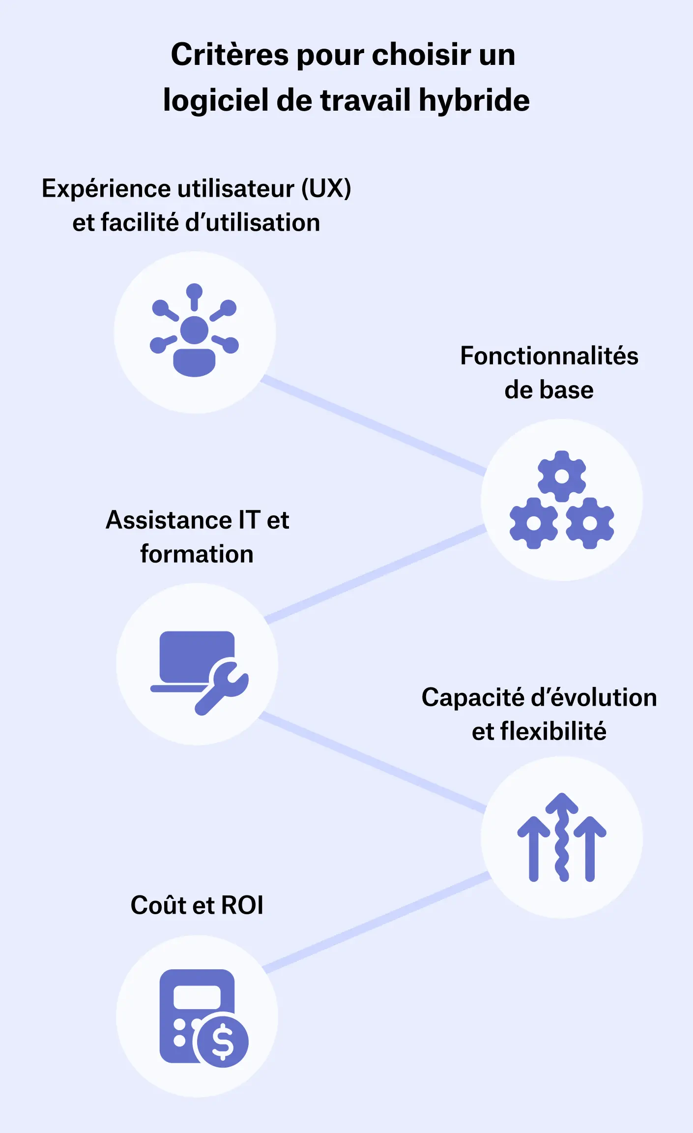 Lorsque vous choisissez un logiciel de travail hybride pour votre bureau, recherchez des outils qui rendent possible le travail hybride mais aussi plus facile, plus efficace et plus agréable pour votre équipe. Un bon équilibre entre convivialité, fonctionnalité, assistance, flexibilité et coût est ce que proposent les meilleures solutions.