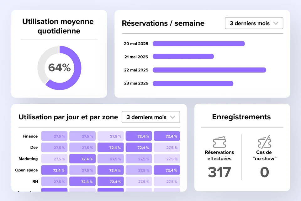 Les analyses de deskbird suivent l'occupation des salles de réunion, la fréquence des réservations, les absences et l'utilisation des ressources. Ces informations aident les équipes chargées des installations à identifier les salles sous-utilisées, à adapter l'espace et à améliorer l'efficacité de la collaboration. Les données peuvent également mettre en évidence les heures de pointe et éclairer les futures décisions d'aménagement des bureaux.