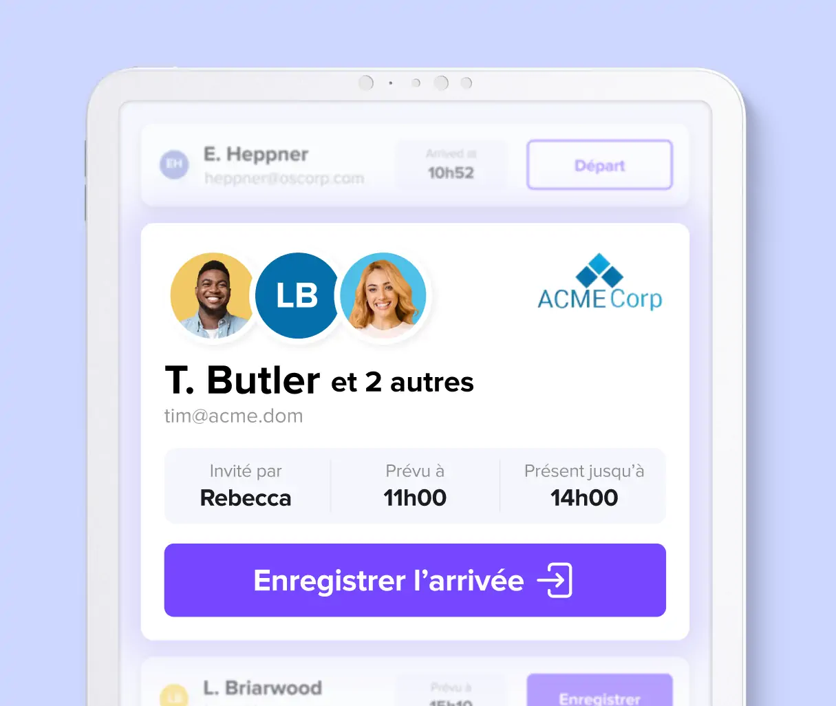 Un enregistrement fluide et personnalisé pour chaque visiteur. Numérique. Connecté à la réception. Sans papier.