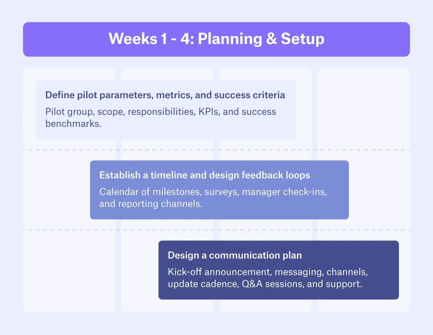 - Kickoff announcement: Communicate the pilot’s purpose, scope, participants, and timeline in a company-wide announcement.