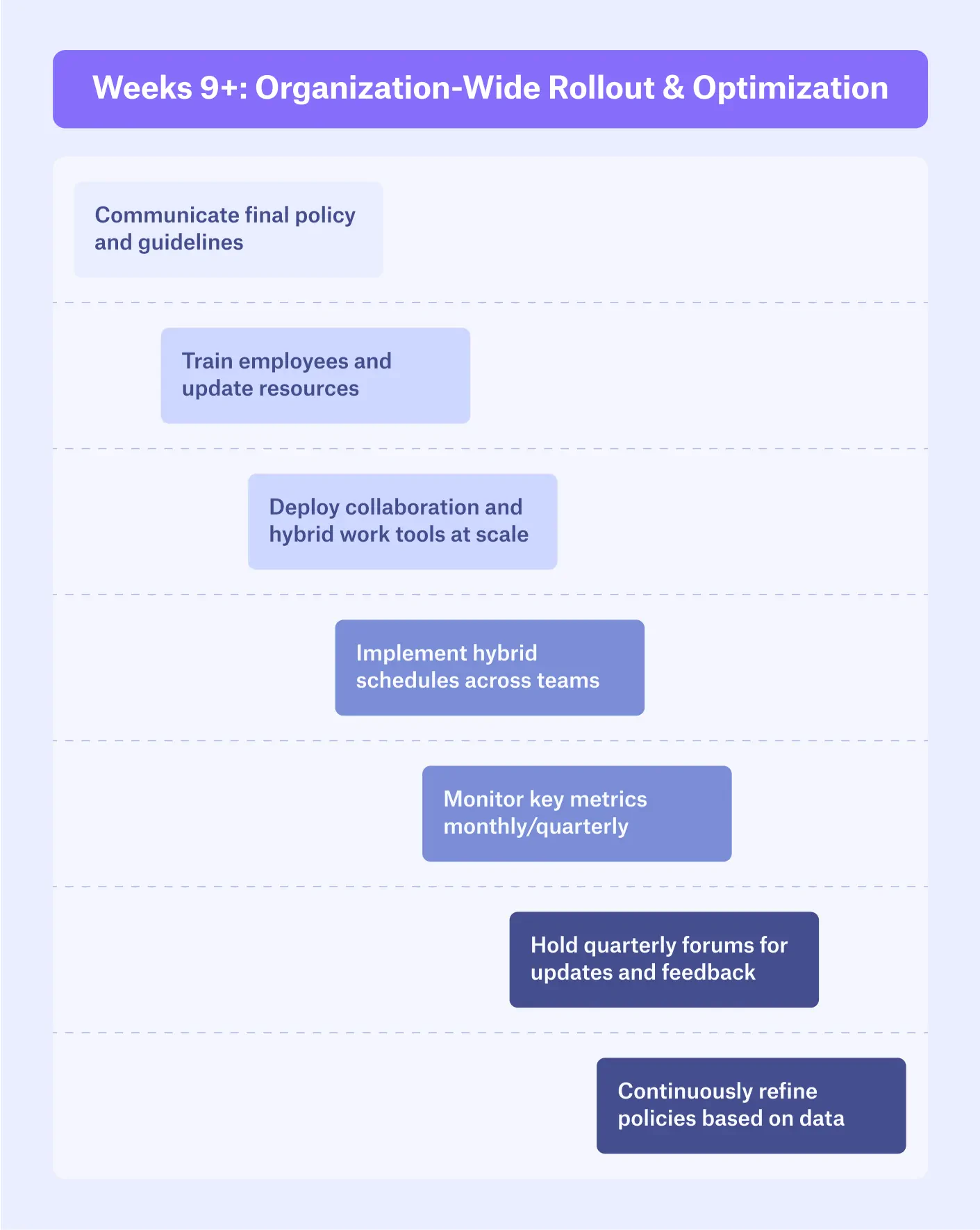 The most effective way to tackle hybrid work implementation is to approach it step by step. Start with a pilot to test schedules, tools, and policies, then use the data and feedback to refine your model before rolling out company-wide. After implementation, make sure to continuously monitor your model and gather feedback from your teams to ensure your hybrid setup stays effective and evolves with employee and business needs.