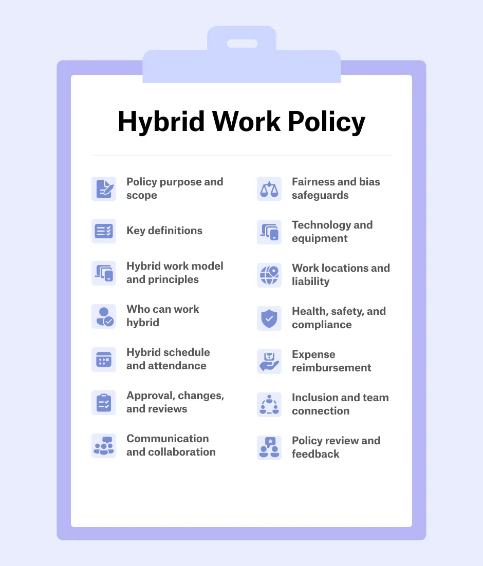 Designing a hybrid work policy is about building a clear, fair, and adaptable framework that works for both your business and your people. Effective policies cover the essentials (purpose, scope, eligibility, schedules, etc.) while leaving room for regular reviews and improvement.