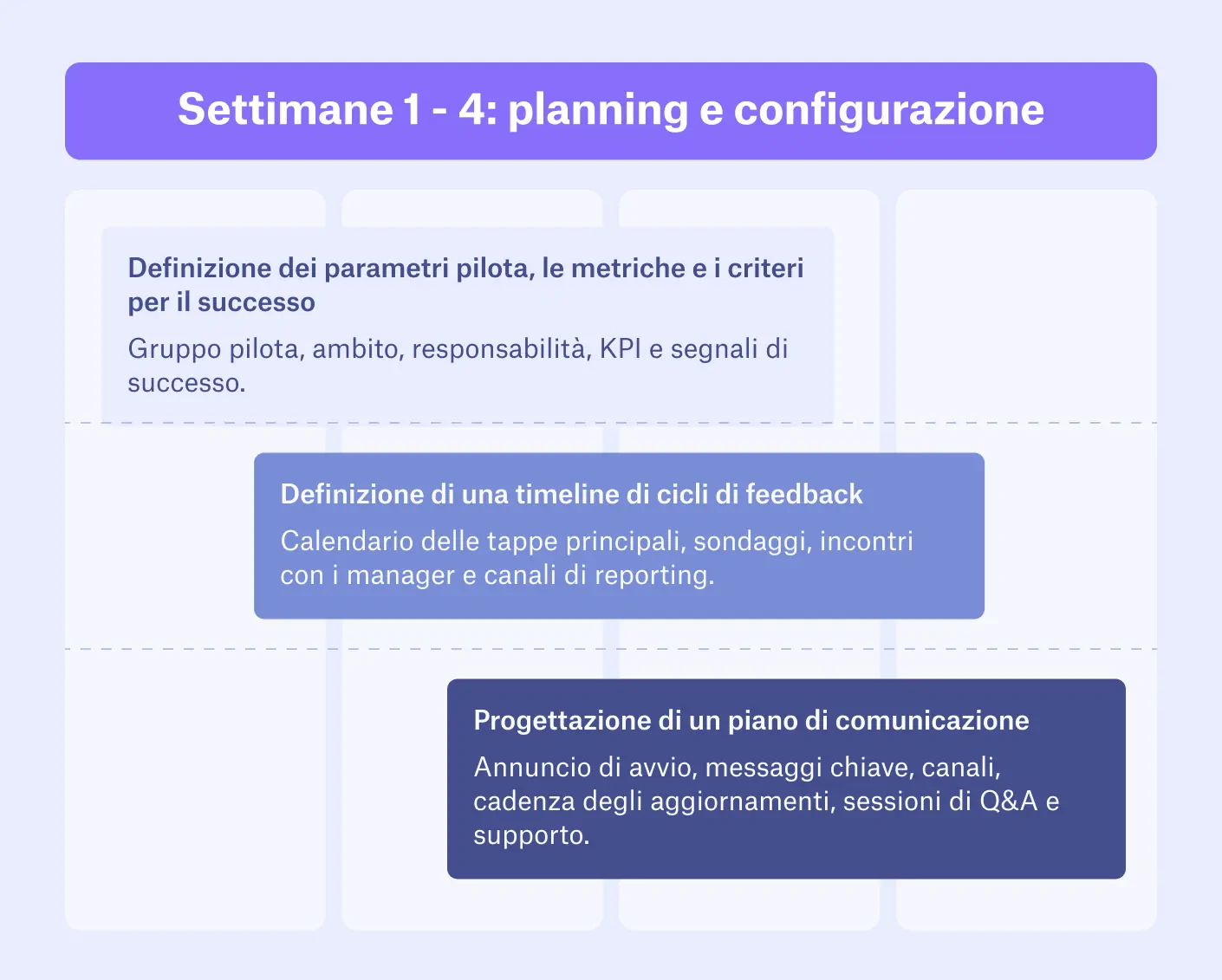 - Ambito del progetto pilota: definisci la durata del progetto pilota (ad esempio, 4-6 settimane) e quali sedi e modelli di lavoro vuoi testare.