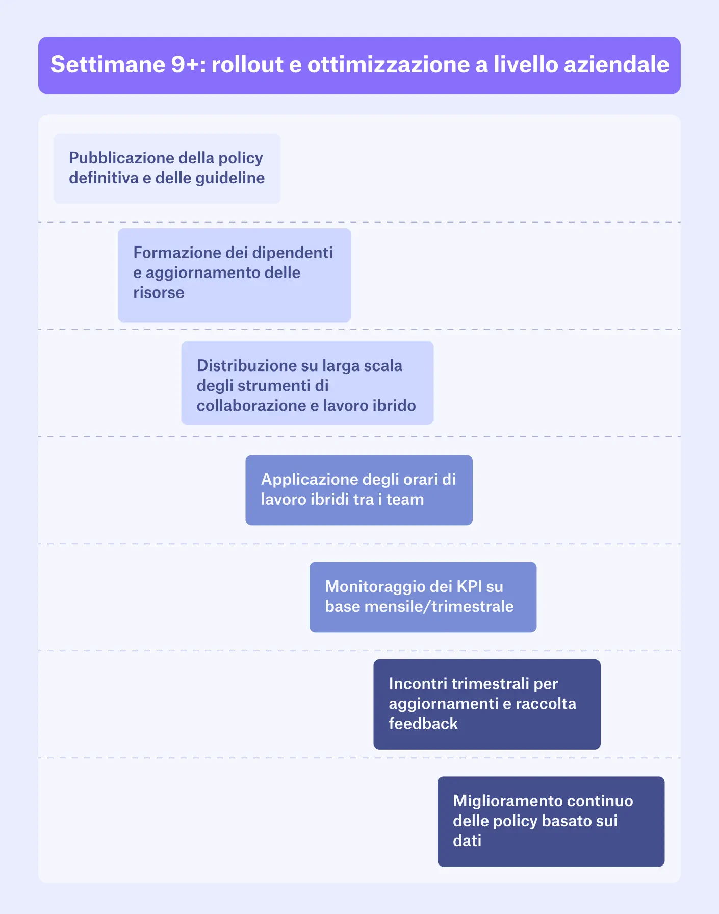 - Lancio del programma ibrido: inizia a testare i programmi di lavoro ibrido come definito nell'ambito del progetto pilota, con chiare aspettative di presenza e flessibilità.