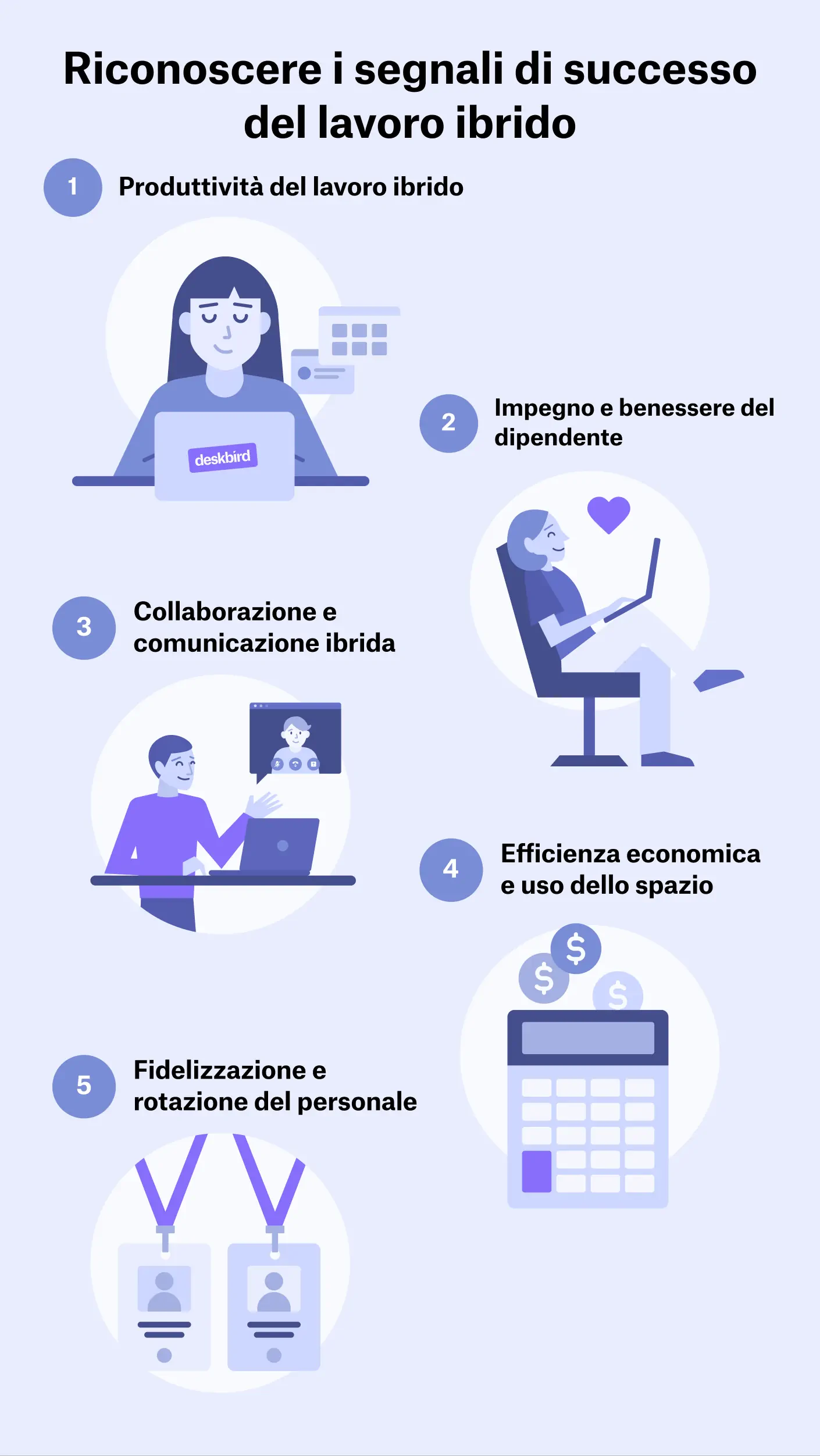 Le metriche del lavoro ibrido dovrebbero combinare indicatori sia organizzativi che relativi ai dipendenti. I cinque elementi essenziali sono la produttività, l'engagement, la collaborazione, l'efficienza dei costi e la retention. Insieme, queste metriche forniscono una visione completa del fatto che le policy di lavoro ibrido stiano guidando la performance, aiutando i dipendenti e fornendo un valore reale per il tuo business.