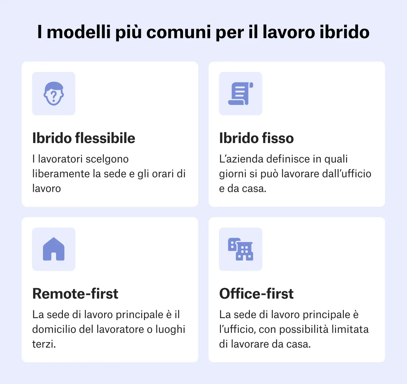 Le aziende hanno la scelta tra quattro modelli di lavoro ibridi : modello ibrido flessibile, modello ibrido fisso, modello ibrido a distanza e modello ibrido in ufficio.