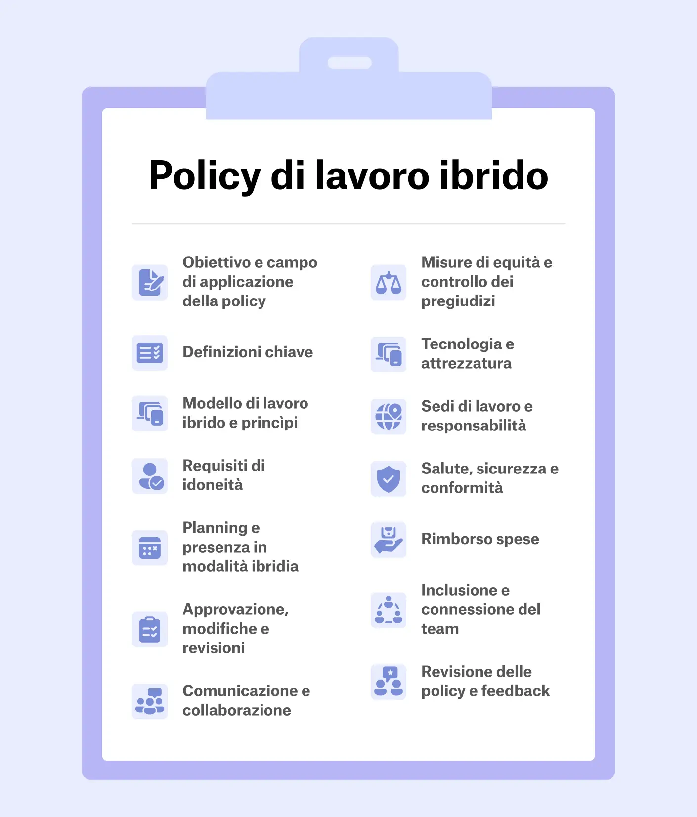 Le policy di lavoro ibrido dovrebbero includere alcuni elementi fondamentali, come i criteri di ammissibilità, il modello e l'orario di lavoro ibrido, gli standard di comunicazione e le regole sul luogo di lavoro. Dovrebbero inoltre fornire definizioni per concetti chiave e linee guida per aspetti come la salute, la sicurezza, il benessere e la conformità.