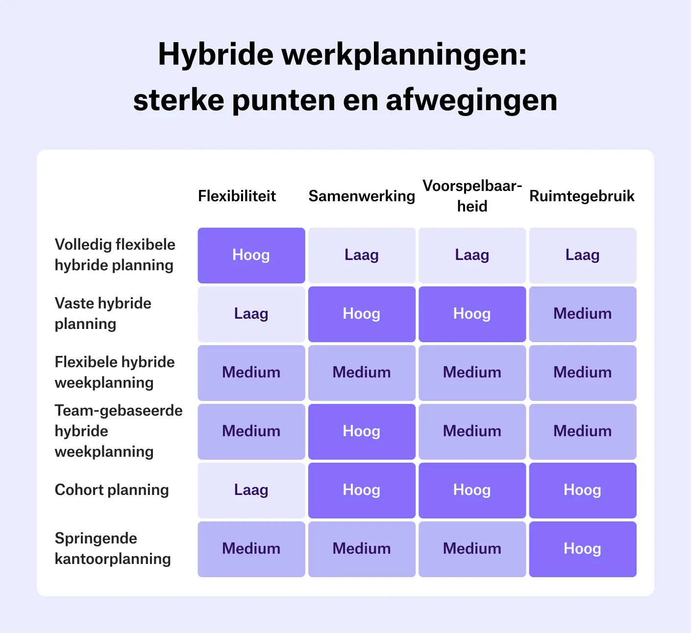 Veel voorkomende types hybride werkplanningen zijn volledig flexibel, vast of bedrijfsgestuurd, 3-2 hybride weken, team-gebaseerde planningen, cohortrotaties of gespreide kantooruren. Elk type planning biedt verschillende gradaties van flexibiliteit, structuur en samenwerking.