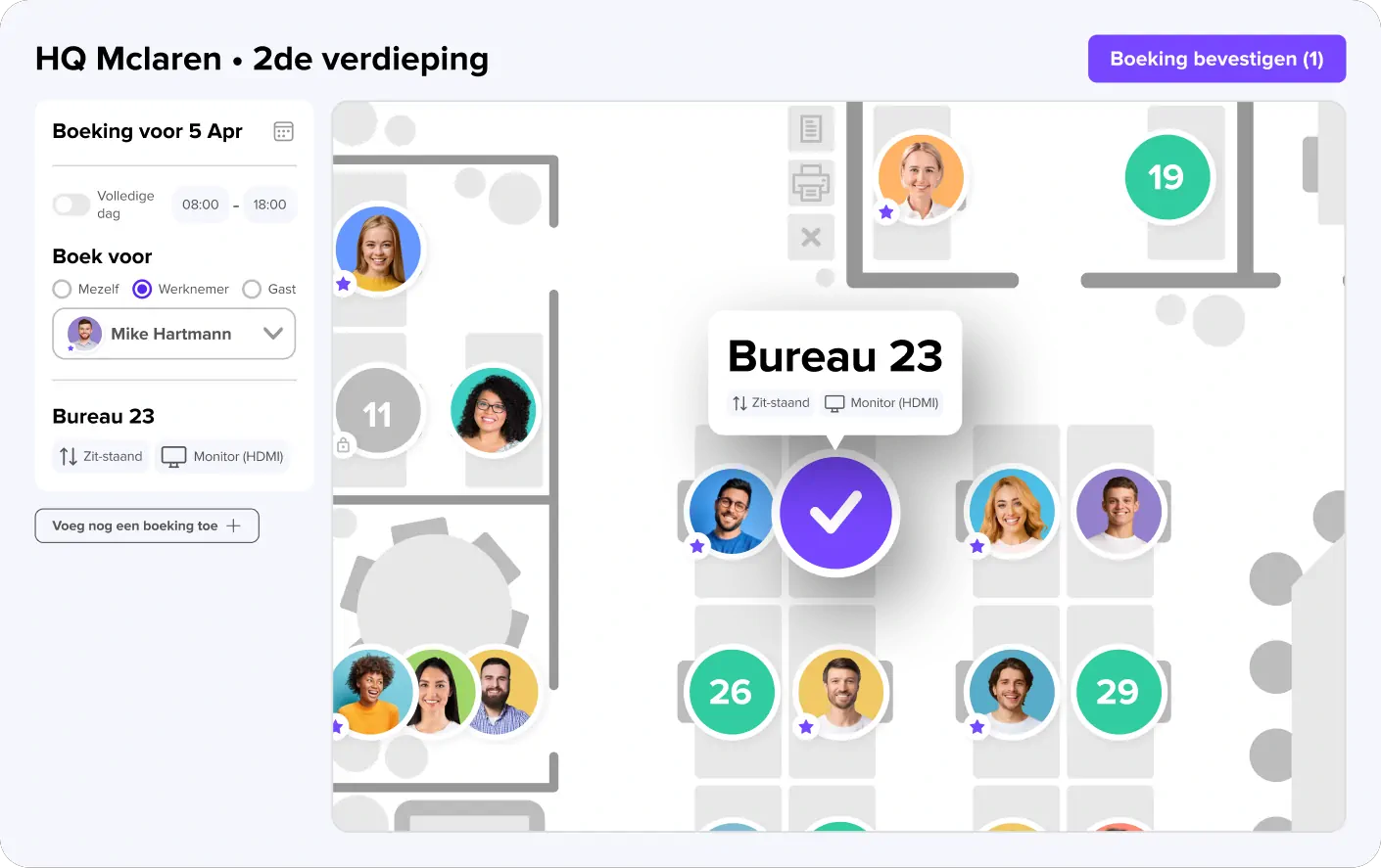 Met deskbird weten werknemers wie er wanneer op kantoor is, zodat ze vergaderingen of groepssessies kunnen plannen. Functies zoals interactieve plattegronden, wekelijkse planningsoverzichten en eenvoudige planning van kantoorevenementen maken coördinatie en samenwerking moeiteloos.