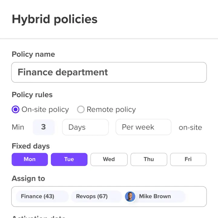 - Create tailored in-office or remote work policies at individual, team, or company level
